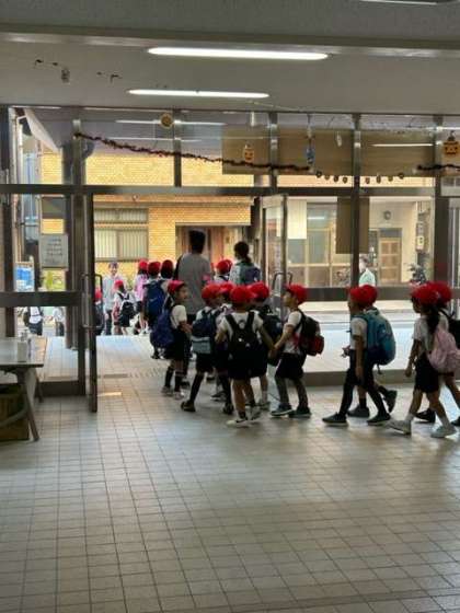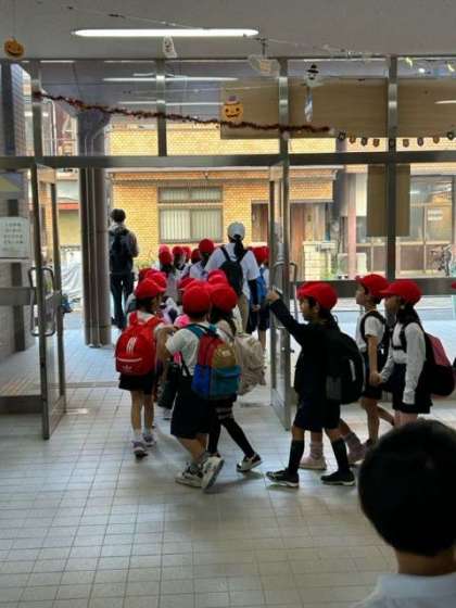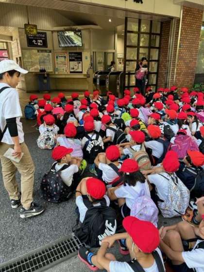 1年生が遠足に出発しました。行き先は長居公園。お話を聞く時も、駅でホームにあがるのを待つ時も、やくそくを守ってがんばっています。たくさんの「秋」を見つけてきましょうね。