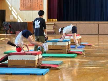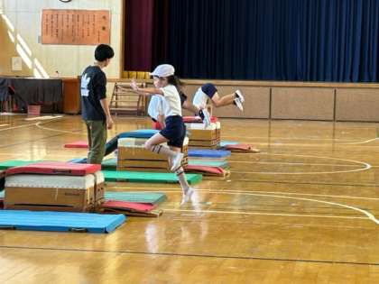 台上前転に挑戦しているのは、4年生の子どもたちです。マット運動で経験した前転運動から、スモールステップで、跳び箱の段を低く設定したり、上にマットを敷いたりの場の設定や、先生の安心感のある声がけやアドバイス、友だちからの拍手、応援もあるなか、ずいぶん恐怖心も和らいできている様子でした。きっともうすぐできる日がやってきますよ。がんばってね。