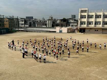 準備体操をする号令の声が聞こえてきました。2年生の体育の時間です。外は日影だとかなり寒くなってきましたが、運動場には陽射しがあって、少しぽかぽか。ゲームの前には「よろしくお願いします!」と、これまた元気な掛け声。明るい陽射しのなか、子どもたちは楽しそうに体を動かしています。