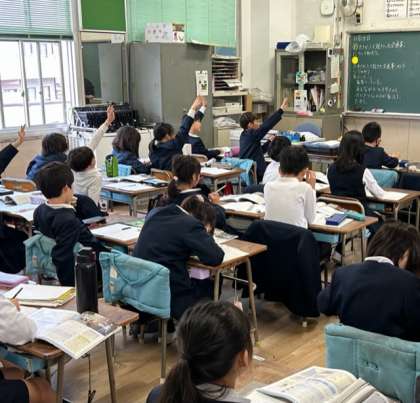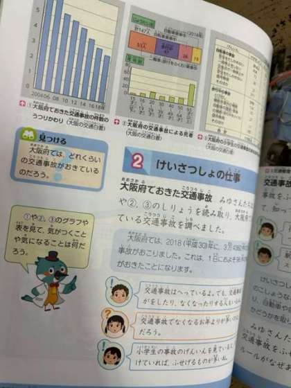 3年生、社会科です。消防署についての学習が終わり、警察署についての学習が始まりました。子どもたちは、先生に掲示された交通事故件数を表したグラフから、気づいたことやよそくしたことについて意見を交わしました。事故件数が年々減ってきていること等から、「前に習った火事の件数より、事故の件数が多すぎてびっくりした」「交通事故がよくおこる場所には、たくさん警察の人が立ってくれてるからやと思う」「でも、たまに信号が無いところってあるよねぇ。あれって何でなんやろ」など、新たな疑問もわいているようでした。
