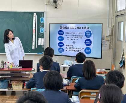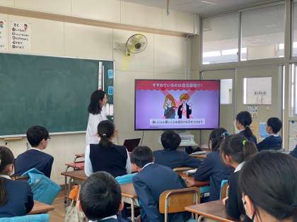 学校薬剤師の先生をお招きして、今日は「お薬教室」の授業が、6年生各クラスでありました。違法薬物のことや、副作用のこと、また、薬を正しく飲むことの大切さについてのお話があるなか、子どもたちが一番驚いたのは、普段、薬を飲むときに、ジュースや炭酸やお茶で飲んでませんか?という問いかけから、実際、透明のプラスチックコップで実験して見せてくださったシーンでした。