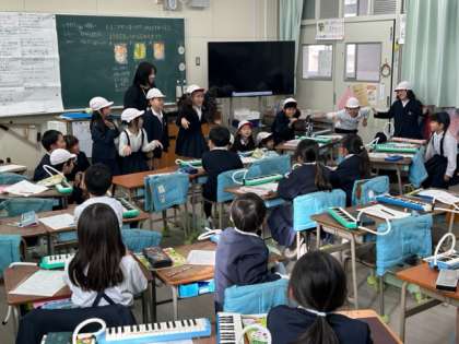 学習が始まると、指名をうけた友だちがつくったリズムを、手拍子をしながらみんなで一緒に楽しくリズム打ちをしたり、鍵盤ハーモニカで指を開けて音を鳴らすところに気をつけながら演奏したり。