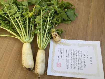 今朝の全校朝会でも紹介したのですが、実は冬休みに入ってから、田辺大根の品評会がありまして、3年生のみんなが育てた大根が、数ある立派な田辺大根がひしめくなか、見事、賞に選出され