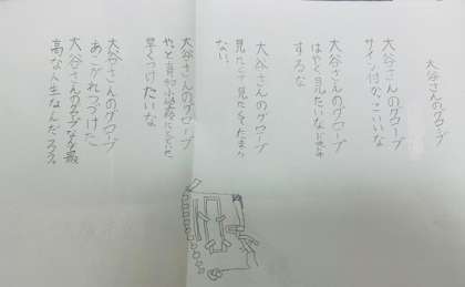 題は「大谷さんのグローブ」。1回読んで、びっくりしました。なんて素直でワクワクするような子どもの気持ち。2回め読んで、感動しました。こんなにも憧れ楽しみにしていたんだなぁと、彼の姿を想像してジーンとしました。そして一緒に、一生懸命描いたグローブのイラスト。この詩は全校朝会でも紹介させてもらいました。