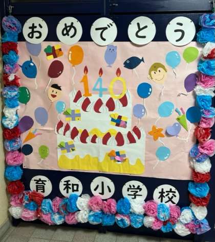 今週からいよいよ「140周年お祝いウィーク」が始まりました。まずは、掲示委員会の子どもたちがアイデアと力を合わせて作成した、巨大誕生日ケーキの掲示物の紹介です。140の数字を型どったロウソク、イチゴの横に添えられた生クリーム、そして風船や周りのお花飾り。見た人みんなを「おめでとう」の気持ちにさせてくれる、心のこもった作品となりました。(玄関入って正面、講堂入口左側に掲示しています。参観の際など、是非またご覧ください。)