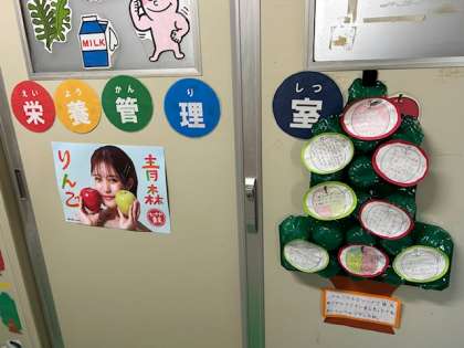 2学期に「東部市場・JA津軽みらい」の方々のご協力とご厚意でたくさんのりんごをいただきました。その後、「りんごエピソード」へのメッセージにご協力をいただきました皆様、ありがとうございました。この度、栄養教諭の先生が、りんごの梱包材を上手に活用し、エピソードとともにステキな掲示物をつくってくれました。