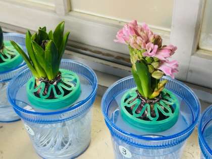 3年生の教室前を通っていると「先生、見て!見て!咲いてんで〜」と手を取って、下駄箱の上のヒヤシンスを紹介してくれました。「こっちは未だやねん。でも、ほら、この中でつぼみが・・・」。この子は毎日よく観察しているのでしょう。見ようとすれば、いろんなことに気づけるのですね。咲くのはもうすぐ、春ももうすぐです。