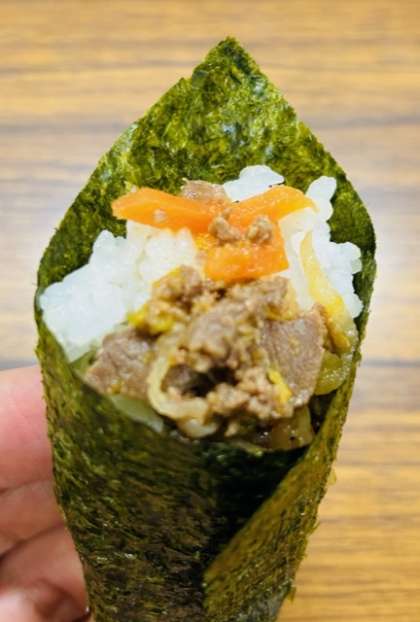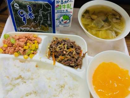 今日の給食は「卒業お祝い献立」でした。手巻きごはんということで、具材の牛肉のコチュジャンいため・さけのカラフルそぼろを、手巻き焼き海苔に上手に巻いて、パクリ。「美味しいねぇ!」と子どもたちにも大好評のようでした。さらに今日は、すまし汁とダイスゼリー(みかん)も付いています。「毎日これでいいわ」「また食べたいねー」とうれしそうでした。