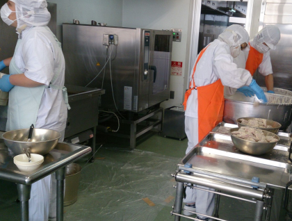 「みそカツ」のカツは、塩、こしょうで下味をつけた豚肉に小麦粉とパン粉でまぶし、油で揚げます。みそは、八丁みそ、赤みそ、砂糖、みりんを使用しています。一人2個あてのみそカツに、児童は大喜びでした。