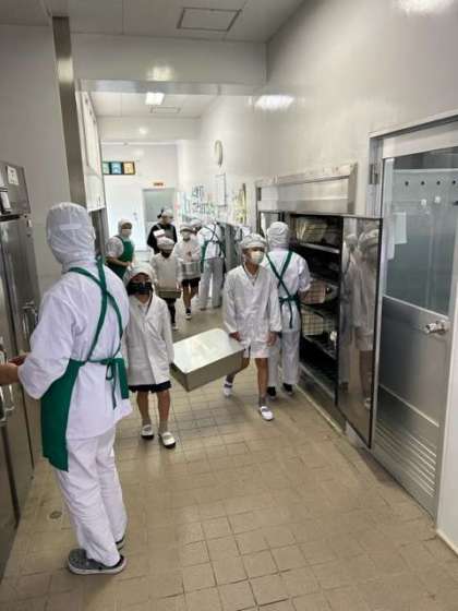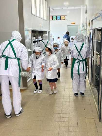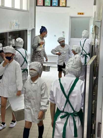 つくってくださった調理員さんとも、「いただきます」と、どのクラスも大きな声で挨拶できていました。運ぶコースも確認しながら、教室へと向かっていきました。