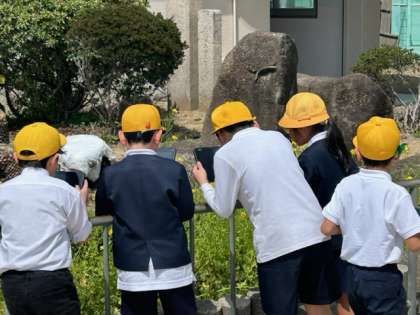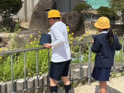一人一人がタブレットを持って、春を探しに、運動場やビオトープを巡って、ただいま観察・発見中です。