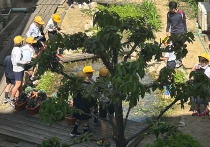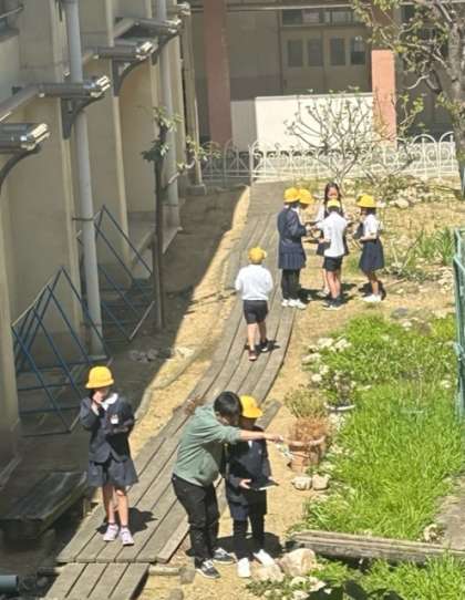 職員室前の廊下を歩くと、2階の窓からビオトープを見おろせる場所があります。この日も、いろんな学年の子どもたちが、春探しに訪れていました。自分で小さな昆虫を発見したり、花が咲いているのを教え合ったり、先生に「あの辺りに注目してごらん」と、教えてもらったり・・・元気に活動しているなぁと見ていたら、ふと顔を見上げて「あ!校長先生やん」と気づいた様子。邪魔してはいけないなぁと思っていたら、「春の校長先生、見ぃーつけた」と、タブレットでパチリと撮影してくれました。
