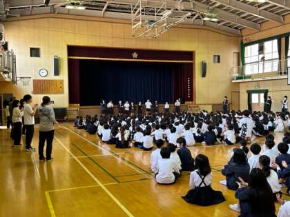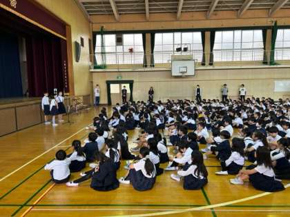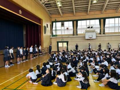 全校朝会の後半、代表委員会からのあいさつ週間のお知らせのあと、先週の委員会活動で決まった、10の委員長さんから、自己紹介と「今年はこんなことを頑張れる委員会にしていきたいです」「こんな学校にしていきたいです」と、意気込みが語られました。一人一人、マイクを握ってほんとにしっかり話せていて、周りの皆んなからの拍手もありましたね。昨年度の高学年がそうであったように、学校のために力を合わせ下級生からの憧れとなる、そんな活動をめざして行ってくださいね。応援しています。