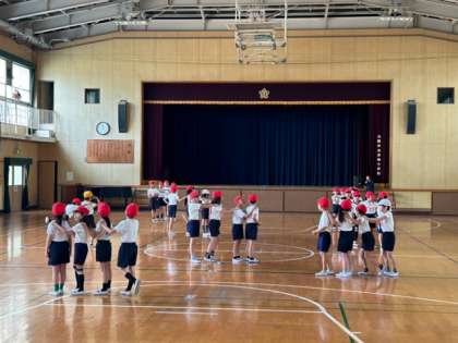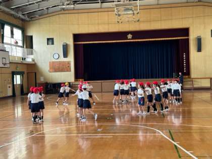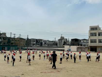 4時間め、3年生の体育の時間です。体育館では、1組が、ジャンケン列車でつながって、ジャンケンのときも、連なって歩いているときも、楽しそうに活動しています。続いて運動場に行ってみると、手前で2組が、奥の方では3組が、準備体操やなわとび運動にチャレンジ。活動の場所はそれぞれ違えど、体育の授業をがんばる子どもたち。しっかり身体を動かしたら、この後は給食です。「おいしい給食が待ってるよ〜」