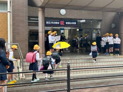 代表委員会の子どもたちによる、朝のあいさつ運動がスタートしました。玄関では「おっはようございます!」と、元気な声が響き渡りました。途中、ある班が到着すると、「なぁなぁ、◯◯くんのあいさつの声、ライフからもう聞こえてたで〜」とリーダーさんが友だちに話しかけていました。子どもたちのやる気、元気に圧倒された、火曜日の朝でした。
