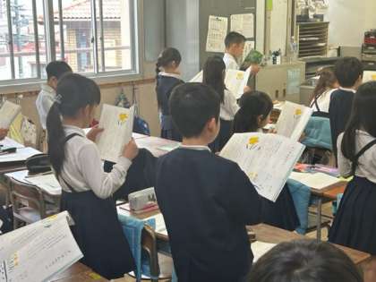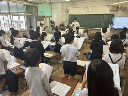「トントン」「トン」と、句点や読点の「間(ま)」に気をつけながら、音読の練習をしている声が聞こえてきました。ただ、それだけなんですが、先生とのやりとりも、何とも楽しそう。子どもたちは、間違えないように一生懸命教科書を見て、声を揃えてついていきます。