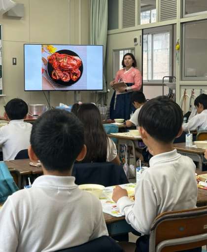 今年度も交流給食が始まりました。毎週月曜日の給食時間にソンセンニムが、各クラスを順番にまわってくださり、韓国・朝鮮の食事や行事、楽器などについてお話をしてくださあます。子どもたちにとってとても楽しみな時間の一つです。2年生では、食事についてのお話を聞きながら、日本との違いや似ているところに気づき、文化について学びました。はじめて知ることが多くあり、「近くの国だけど、全然違うな」と話していました。