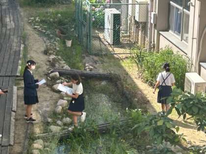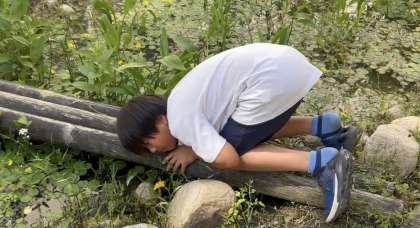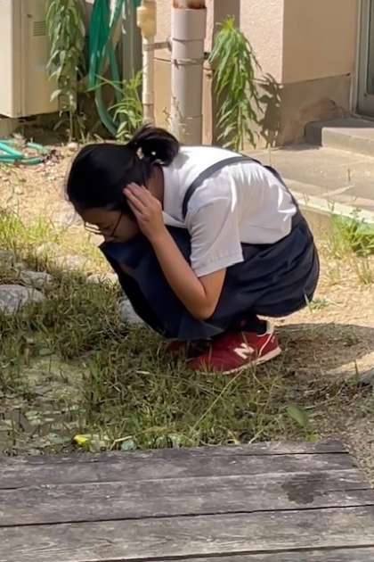 ?6年生がビオトープにやってきました。今日は理科の時間?いえいえ、図画工作の時間です。取り組んでいるのは「音集め」。普段はあまり気にしない、気づかないような学校で聞こえる「音」を集めて、それを今回は「色や形」で表現します。友だちと来たあと、もう1回一人で戻ってきて、耳を潜めて・・・。こういうことに、素直に取り組む子どもたち、そして、心で感じよう、響かせようとする姿に、子どもの感性ってすてきだなぁと、改めて感じたひとときでした。