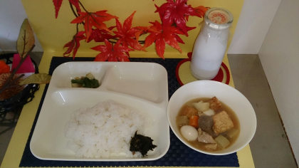 本日の給食は、「ご飯・関東煮・三度豆のからしあえ・のりのつくだ煮・牛乳」でした。
