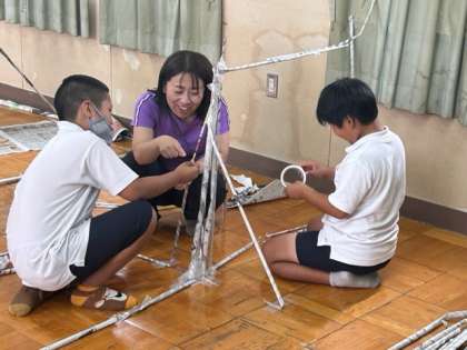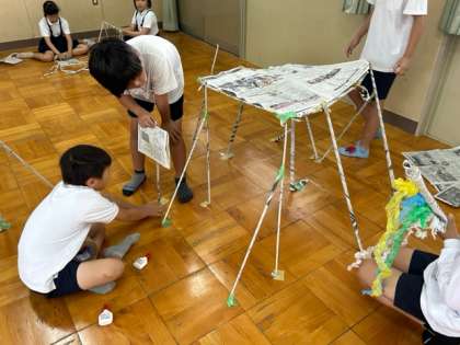「真っ直ぐ立たないけど、斜めに支えになるようにしたら・・・、ほら!うまく立ったよ〜」「束にしても、いいよね」「ねぇねぇ、そっち持って〜」「おっしゃ、任せろ〜。しっかり結んでや」と声をかけ合ったり、お手伝いし合ったり。しばらく多目的室から離れ、再び戻ってみると、「先生〜、見て見て〜」と大歓迎。どの場所に行っても子どもたちの作品についてのトークが止まりません。また、その変化や進化にも驚かされました。