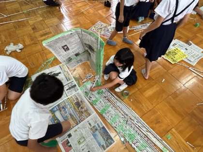 ?新聞紙をくるくる巻いて、どの巻き方が強くていいかな、と意見を交わし、試行錯誤してつくって貯めてきた材料。それをどんどんつないで組み合わせて・・・。楽しそうな声が聞こえてきました。