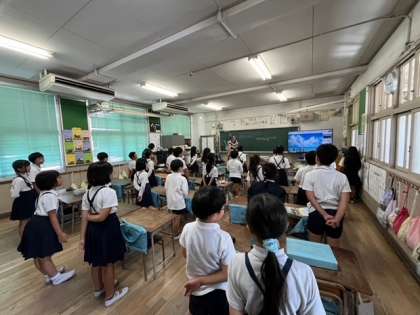 式に先立って、各種大会から届いた賞状の表彰式では、受け取ったあと、チームごとに並んで笑顔で画面に映ったり(拍手〜)、続いて各教室では夏休みのくらしについての諸注意やお話を聞く姿がありました。話の最後に「礼」をすると、ちゃんと「礼」をしていましたよ、と後で先生が教えてくださいました。