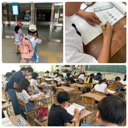 終業式の次の日、朝から「おはようございます。」と元気よく挨拶をし、各教室に向かっていく子どもたち。「夏休みの宿題がんばるねん!」とやる気満々の表情を見せてくれました。教室を覗いてみると、黙々と漢字を書いていたり、わからないところを積極的に質問したり、また友だち同士で教えあう姿も見られました。どの学年も自分のペースで課題に取り組んでいました。また今週も、がんばるみなさんを待っていますね。