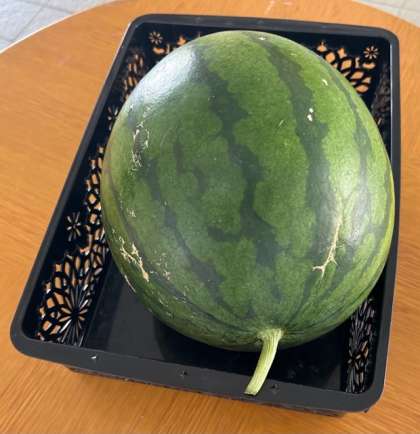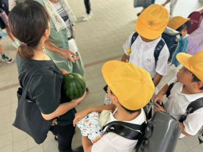 子どもたちが囲むようにして注目していたのは、学校で育った立派なスイカです。そうっと撫で撫でして、「またねー!」と帰って行きました。