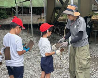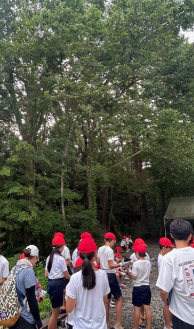 「先生、何?この鳴き声みたいなの」「鳥かなぁ」・・・聞こえてきたのはヒグラシです。大阪のクマゼミの鳴き声と違って、どこか柔らかで穏やかな感じがします。太陽も隠れて、少し過ごしやすくなってきました。