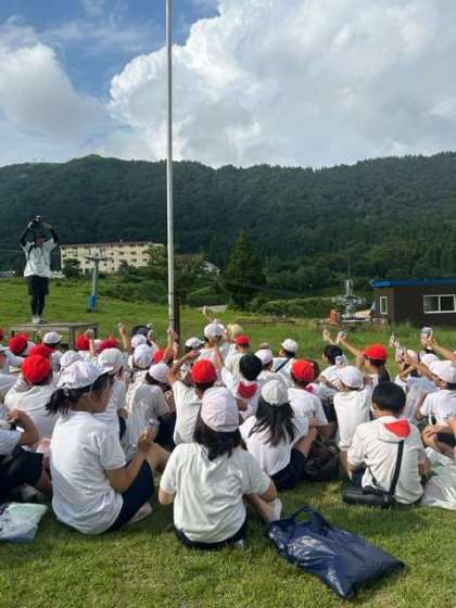 沢のぼりのあと、宿舎前の広場に集まって、PTAの皆さんからいただいたオレンジジュースを皆んなで飲みました。「冷たくて美味しい〜」「今まで飲んだ中で、1番美味しいジュースかも」「お家の人にも帰ったらまたありがとうって言わんと」などなど、みんなでほっこりしました。