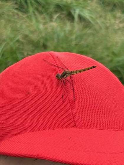 見てみると、帽子にトンボが止まっていて、多少動いても逃げようとしません。