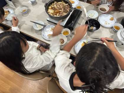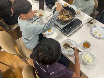 今夜のメニューはすき焼きです。横には魚のフライもついています。「お腹空いたーっ!」と、日中よく活動したので、子どもたちの勢いが違います。よく噛んで、味わって食べてくださいね。