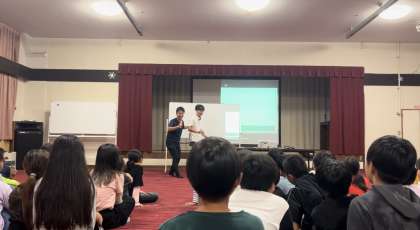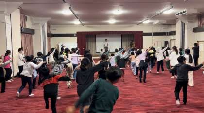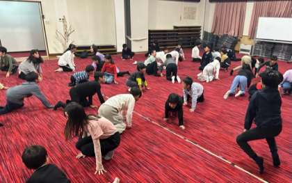 夕食のあと、大広間に集まって夜の集いを行いました。2人の先生たちが準備してきた「スリーヒント先生クイズ」に、「進化ジャンケン」。昨日のキャンプファイヤーでは、本人曰く「不完全燃焼でした」(本当は全然そんなことはなく、充分盛り上がりだったんですが)という「GOバナナ完全バージョン!」に、子どもたちは大喜び。クイズに正解したら拍手!ジャンケンする度にいろんな動物に変身して、歩き回り跳ね回り、最後は「GO!バナナ!GO!GO!バナナ!」のパーフェクトダンスに、広間は再び大盛り上がり!でした。