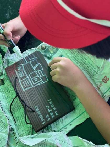 場面が続くようにと、側面まで絵をつなげている子。「やっぱりキャンプファイヤーが1番!バリ楽しかったー!」と前にドドンと出して見せてくれる子。お世話になった白樺館を描いて「これ見たら、林間の楽しかったこと思い出せる」と感謝の気持ちを描いてる子。