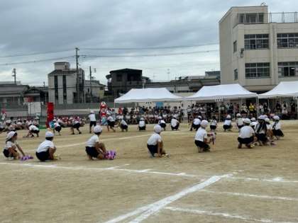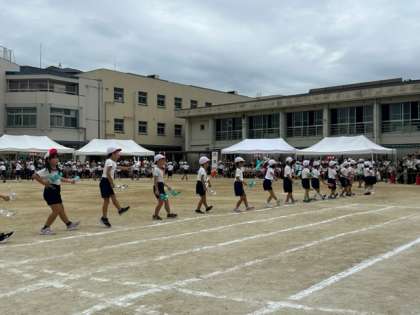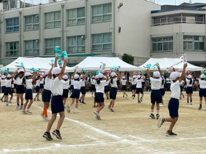 ?プログラム4番は、2年生団体演技「夢いっぱいのペットボトルダンス」です。キラキラかがやくペットボトルを使って、楽しくダンスしました。可愛らしい振り付けに、みんな大注目でしたね。