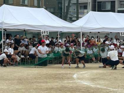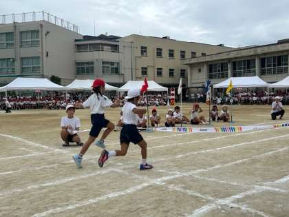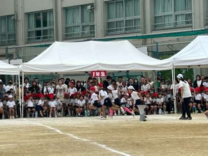?プログラム5番は、3年生「とんで くぐって ゴールをめざせ!」です。ミニハードルを飛び越え、網の中をくぐり、ゴールをめざして走りきりました。また、途中の素早い「ケン、ケン、パッ」も、練習の成果を発揮しましたね。