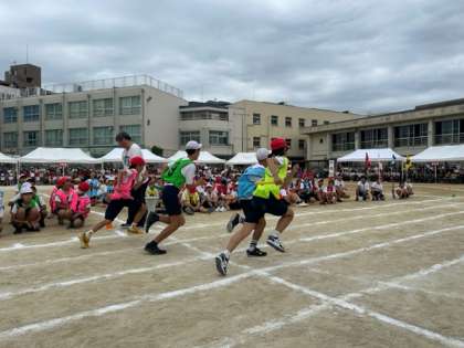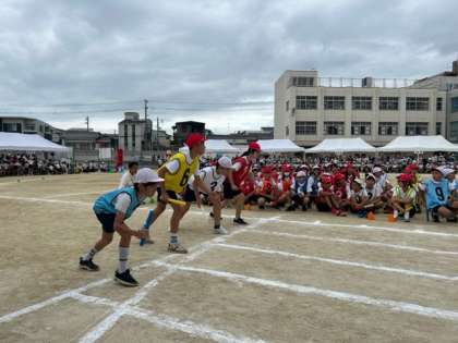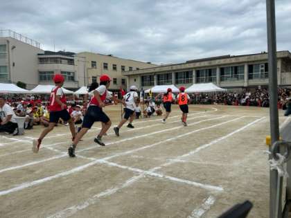 ?プログラム7番は、6年生の「紅白対抗リレー」です。小学校生活最後の運動会。これまでのがんばりをバトンに込めて、熱いリレーで会場を盛り上げました。迫力もすごかったですね。最高学年の子どもたちの一生懸命な姿に、アンカーがゴールするまで大声援が送られました。
