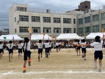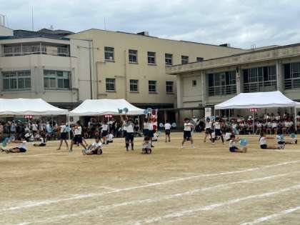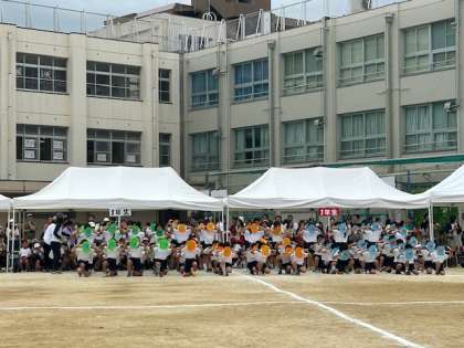 ?プログラム9番は、3年生団体演技「3sun(サン)ハロー」です。うちわを使って元気に楽しく踊りました。テンポの速い曲なので、動きを揃えるだけでもなかなか難しさがあるなか、何度も何度も練習を重ねてきた子どもたち。ポーズもばっちり決まっていましたね。