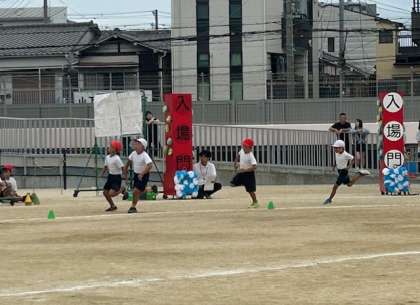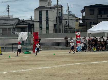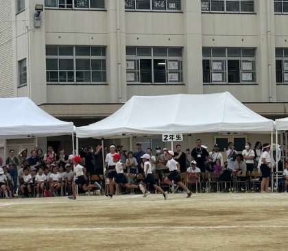 ?プログラム10番は、2年生徒競走「ゴールへむかって走れ」です。運動会でのかけっこは初めての2年生。練習もたくさんして、カーブも上手にまわって、最後まで一生懸命ゴールに向かって走る姿に声援が飛び交っていました。