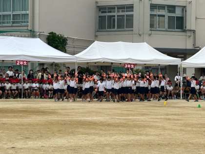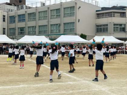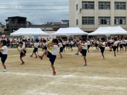 ?プログラム12番は、1年生団体演技「すまいる!スマイル!smile!」です。1年生は、初めての運動会に向け、馴染みのある曲で、いつも元気に楽しく練習してきました。いっしょうけんめいで可愛らしく踊る1年生の姿に、みんなが笑顔になりました。