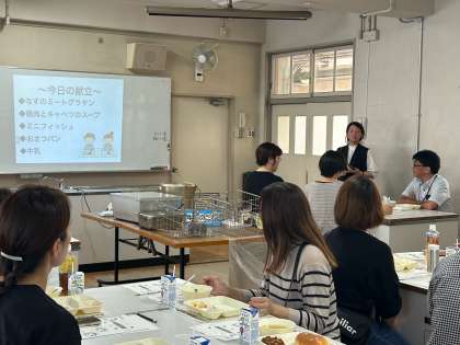 試食したのは中学年のパンの大きさです。高学年はもっと大きい事にみなさん驚かれていました。主食をしっかりとる事の大切さをお伝えしました。
