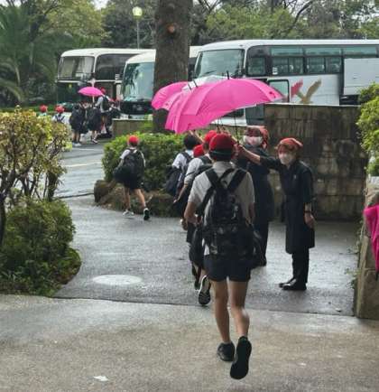 女将さまからは、この言葉を従業員皆んなに伝えますということ、また子どもたちへのお褒めの言葉と、「皆さんが出発されるときには、すべての鳥羽の旅館では、この赤いハンカチを振らせてもらっています。これはお別れではなく、また会いましょうね、再会しましょうね、という意味。シーユーアゲインです。」と、お話を聴かせてくださいました。いろんな方々に支えられて、この修学旅行は成り立っています。急な対応にも快くご配慮いただきました女将さまを始め、すべての方々にあらためて感謝申しあげます。たいへんお世話になりました。