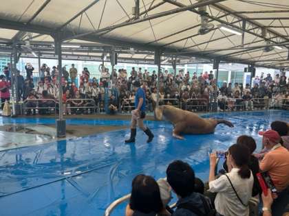 会場には早くから場所を取って、待ち侘びているグループがありました。セイウチが登場すると、そのでっかさに目をパチクリ。「おぉー」と歓声もあがっていました。