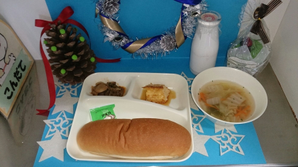 本日の給食は、「牛肉のケチャップソテー、はくさいのスープ、焼きプリン、牛乳、コッペパン、マーガリン」でした。