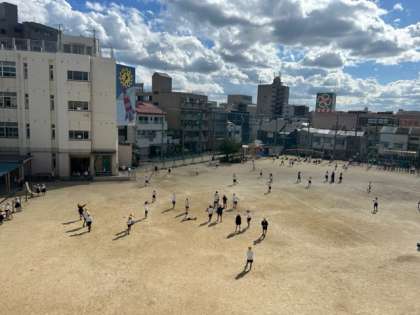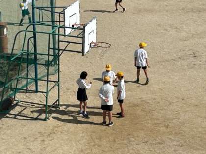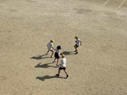 チャイムが鳴ると、元気に運動場へ飛び出してくる子どもたち。バスケットゴールの下に目を移すと、集まって何やらチーム分けをしているようです。そのあとしばらくはゴール近くで遊んでいましたが、そこはコートがない運動場。どんどん遠くへ離れていってしまいました(笑)。どこまで行くかなーと思って見ていると、ひとしきり回って、再びゴール下へ。その繰り返しがほんとに楽しそう。そんな休み時間のひとコマでした。