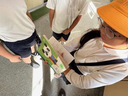 廊下を歩いていると、子どもが声をかけてくれました。話を聞くと、理科で鏡を使って光の反射の