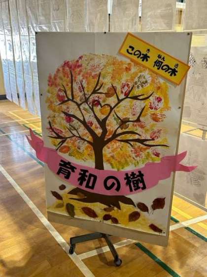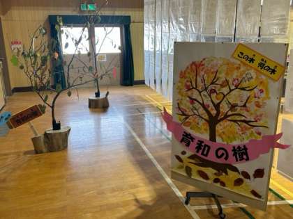 今回の作品展では、前回の作品展に続き、子どもたちへのメッセージを届けるメッセージコーナーを設けさせていただきました。ただ、前回と一緒じゃ楽しくないよね〜と、管理作業員さんがすてきなツリーを準備してくださいました。その名も「この木 何の木 育和の樹」です。鑑賞に来られた際には、講堂出入り口付近にありますので、ぜひお立ち寄りください。そして、子どもたちに一言、感想やことば(イラストもオッケーです)を添えて、枝に吊るしていただけるとうれしいです。きっとこれからの子どもたちの励みへとつながります。3日間で、すてきな「育和の樹」へと育っていきますように。