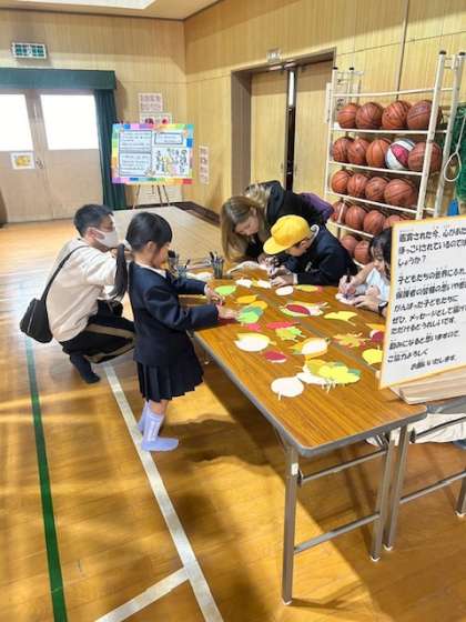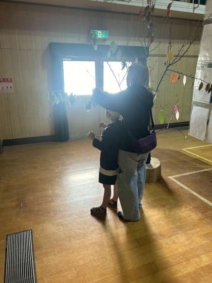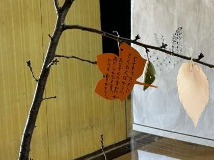 熱心に感心しながら鑑賞いただいた後、枝に結びつけてくださった心あたたまるお言葉。「すてきでたのしいさくひんばかり。みなさんのすがたがめにうかびます。ありがとう。」子どもたちの心にも、あたたかいまま届いています。ありがとうございました。