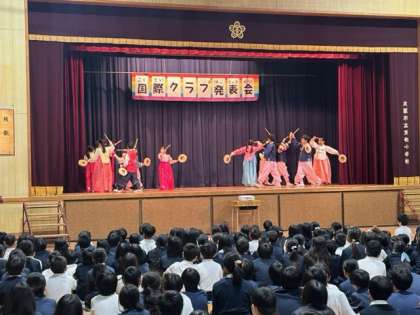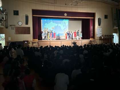 今日は国際クラブの発表会がありました。この日に向けて、クラブの友だちが練習を積み重ねてきたことを見たり聞いたりして知っている子どもたち。開会前から「ワクワクしてきた」「今年も楽しみ〜」と会場の雰囲気もムンムン、といった感じでした。司会の子どもたちの進行で、さあ、入場。ある子は緊張した表情で、またある子は笑顔で手を振るなど、様子は様々でしたが、拍手や手拍子で向かい入れるすてきな雰囲気に包まれていました。