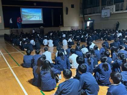 突然の訪問で、子どもたちはびっくり。拍手と歓声のなかのお出迎えのあとは、万博の紹介あり、クイズあり、そして写真撮影ありで、皆んなでたいへん盛りあがりました。またひとつ思い出ができました。